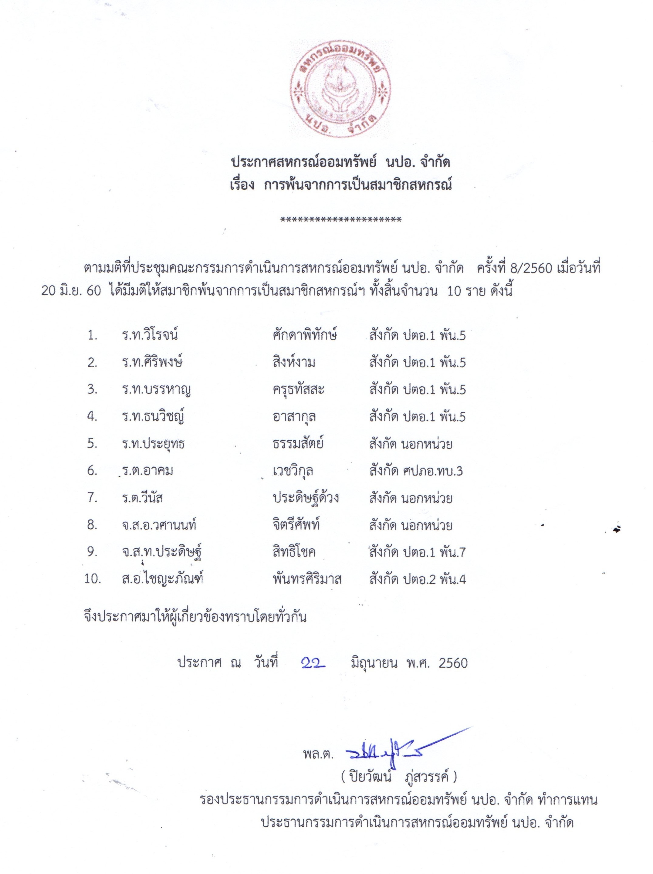 Home » ประชาสัมพันธ์ & กิจกรรม » ประชาสัมพันธ์ » ประกาศสมาคมฌาปนกิจสงเคราะห์สมาชิกสหกรณ์ออมทรัพย์ทหาร ประกาศ สหกรณ์ออมทรัพย์ นปอ. จำกัด เรื่อง การพ้นจากการเป็นสมาชิกสหกรณ์ ประจำเดือนพฤษภาคม ครั้งที่8/60 วันที่ข่าว : 26 มิ.ย. 2560